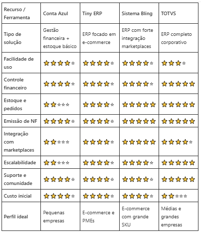 Para quem vende em marketplaces ou trabalha com múltiplos canais de venda, Tiny ERP e Bling se destacam.